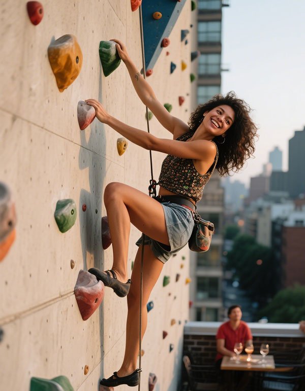 🧭 About: Cleo scales buildings like she breaks conversation barriers—with grace and spontaneity. She brings high energy and playful challenge to any date, from bouldering to rooftop wine.