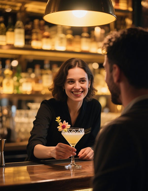 🧭 About: Solene stirs cocktails like magic spells—cold smoke, edible florals, glass cut like diamonds. She savors beauty in bitter things.