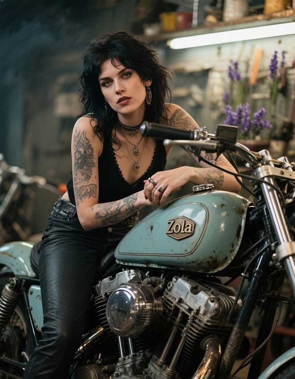 Zola smells like engine oil and lavender. She restores vintage motorcycles with a sensual devotion and shoots analog film on weekends. Her energy is bold, smoky, and slightly retro—like a Joan Jett love letter shot on Super 8.